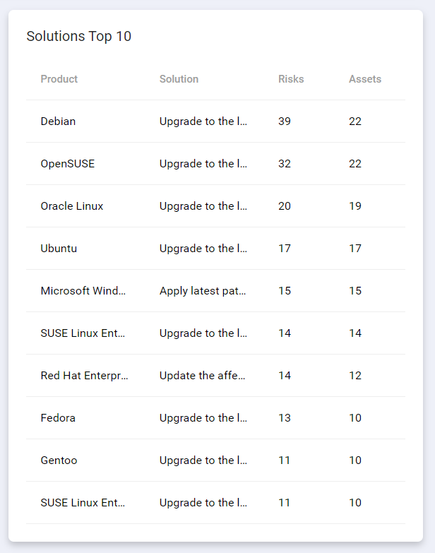 Solutions Top 10 shows ten actions that will resolve most vulnerabilities along with the number of risks and affected assets in unmanaged asset groups.