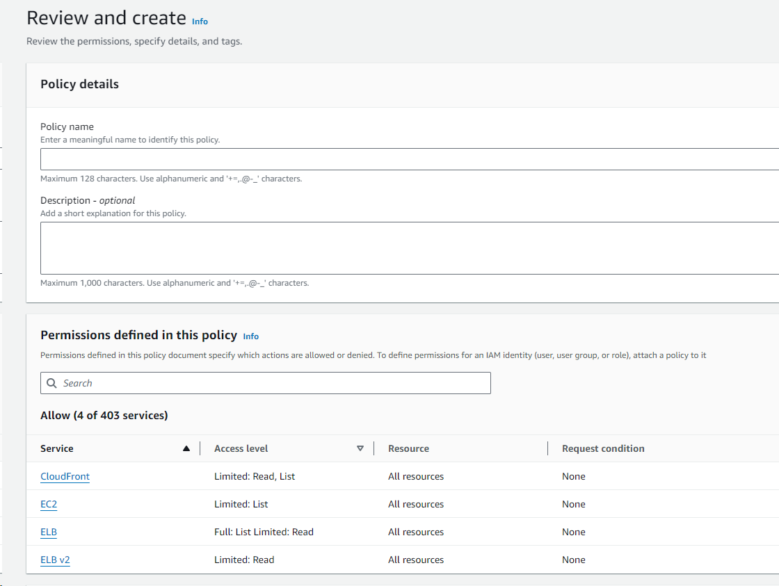 CODE{ "Version": "2012-10-17", "Statement": [ { "Sid": "Stmt1400711494000", "Effect": "Allow", "Action": [ "ec2:DescribeInstances", "ec2:DescribeRegions", "ec2:DescribeTags", "elasticloadbalancing:DescribeLoadBalancers", "elasticloadbalancing:DescribeTargetGroups", "elasticloadbalancing:DescribeTargetHealth", "elasticloadbalancing:DescribeTags", "cloudfront:ListDistributions", "cloudfront:ListTagsForResource" ], "Resource": [ "*" ] } ] }Click the blue Next-button on the bottom right.