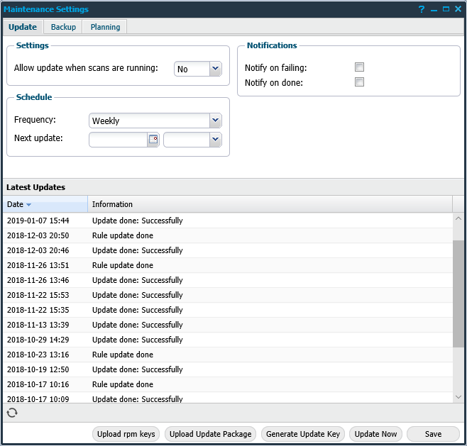 Schedule | Allows you to schedule your updates on a regular basis. Here you can specify the frequency, date and time of the next update. |