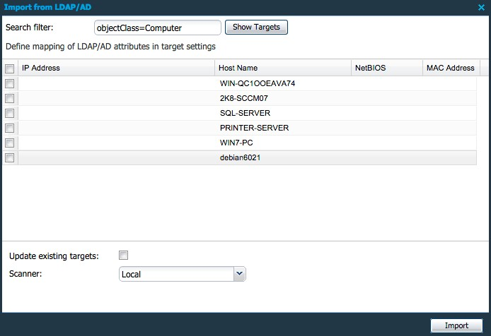 Base DN (Targets) | Enter the base domain name. This is used only when importing targets. |