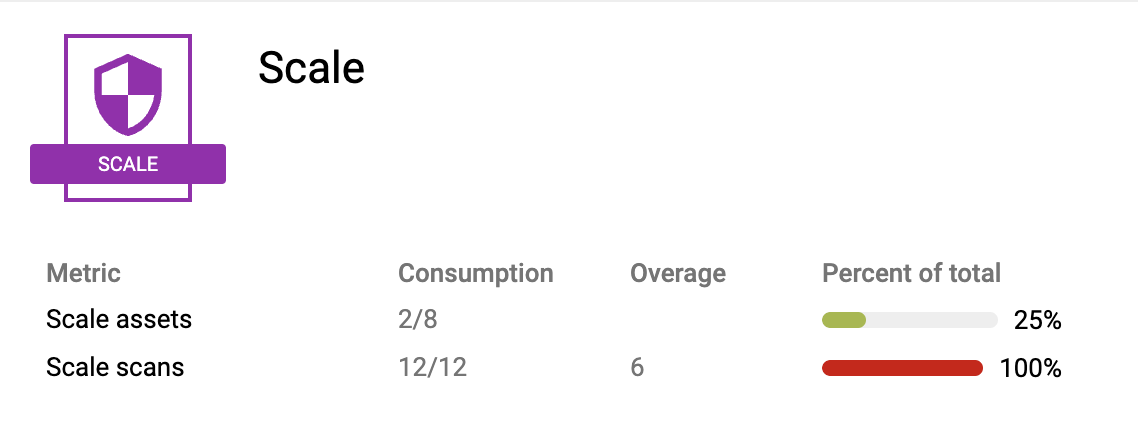 The consumption is aggregated by calendar month and are displayed as number of scans as well as number of distinct assets scanned during the period.