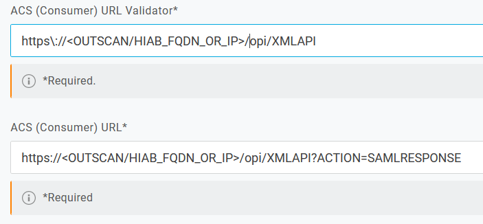 Adjust ACS (Consumer) URL Validator and ACS (Consumer) URL by replacing <OUTSCAN/HIAB_FQDN_OR_IP> with the FQDN or IP address of your OUTSCAN or HIAB setup.