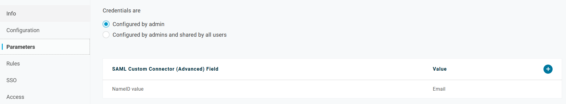Update the Application / Parameters of the newly created application to reflect OUTSCAN or HIAB setup, by adjusting/customizing the SAML Custom Connector (Advanced) Field as following: