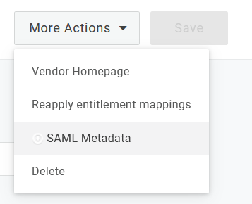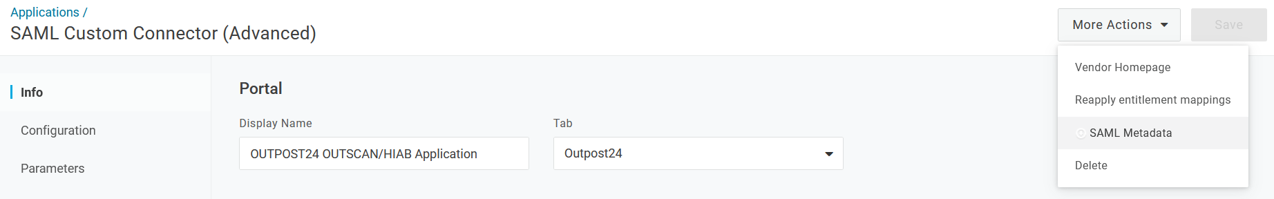 It is now possible to retrieve and download the SAML Metadata file by clicking on the More Action drop-down menu in the top right corner and select SAML Metadata. This file is used during the OUTSCAN or HIAB configuration step located under generic Integration / Identity provider.