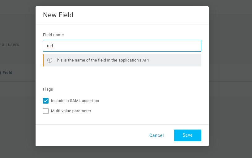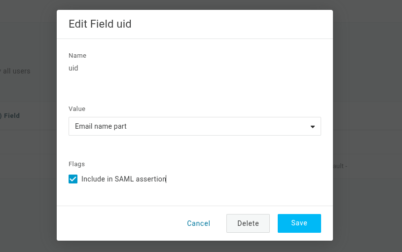 Clicking the Save button, you will save this field and be able to adjust its value, by selecting the proper value according to you settings in OUTSCAN or HIAB. For example, in case of email address, you can select the Email value. Ensure you also enable it in the SAML assertion by checking the Include in SAML assertion check box as follow.