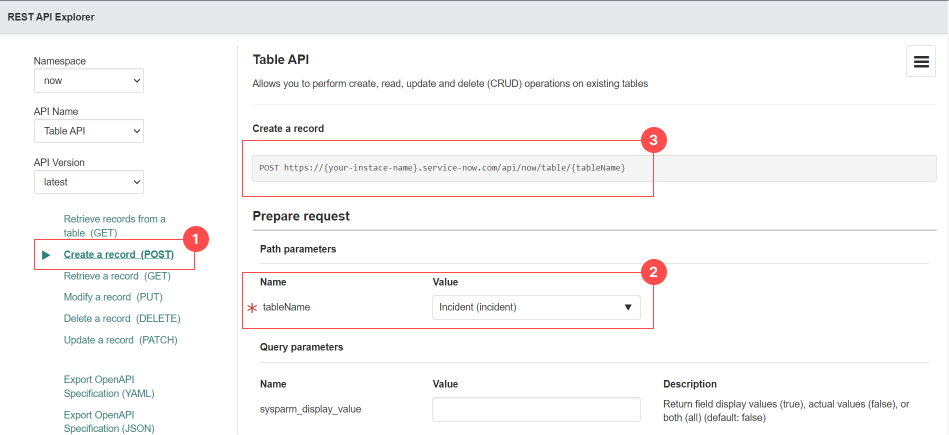 The variable {tableName} is the one you selected in step 2. In this case, the full URL would be:XMLhttps://{your-instace-name}.service-now.com/api/now/table/incidentsScroll down to the Request Body section and click on Add a field.