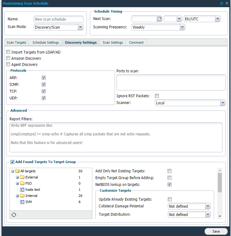 Force Target Groups in Scan Scheduling | If checked, user cannot add target list in the Edit Scan Schedule window, enforcing to select a target group instead. |