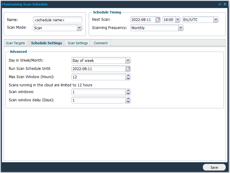These settings can be changed later in the Scan Schedule module, but only within the scope of the values configured here.