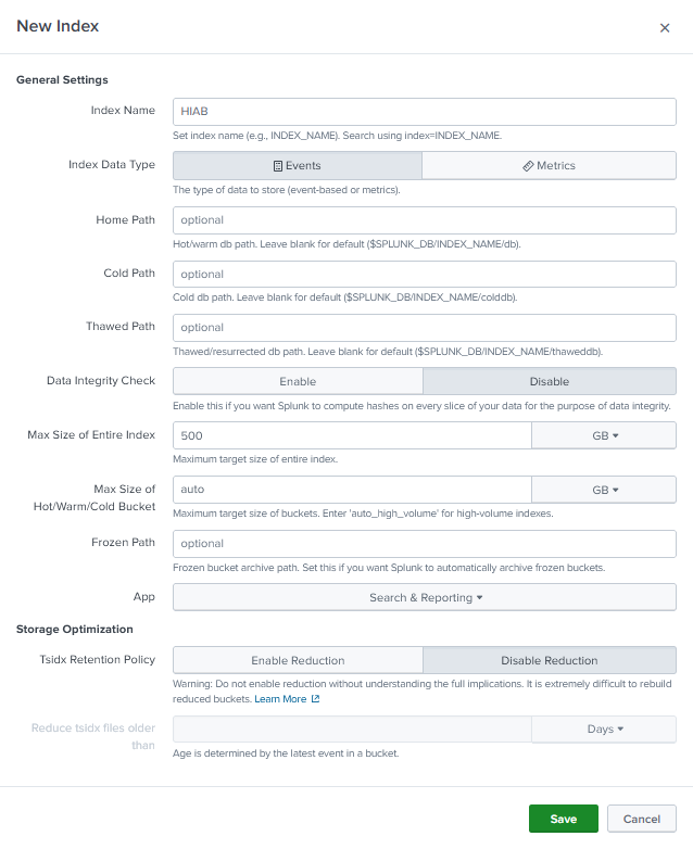 It is recommended to create a new user with limited access rights and a separate Splunk index for the data sent from the HIAB to Splunk.